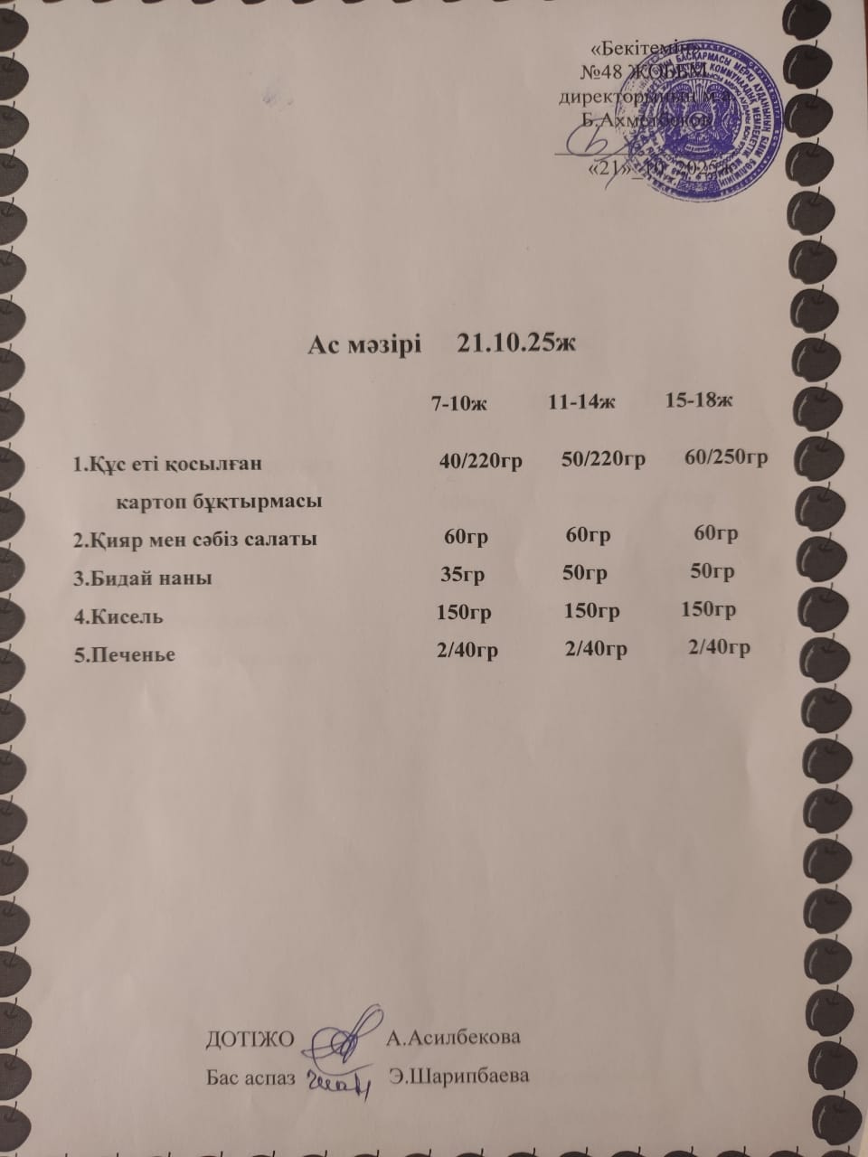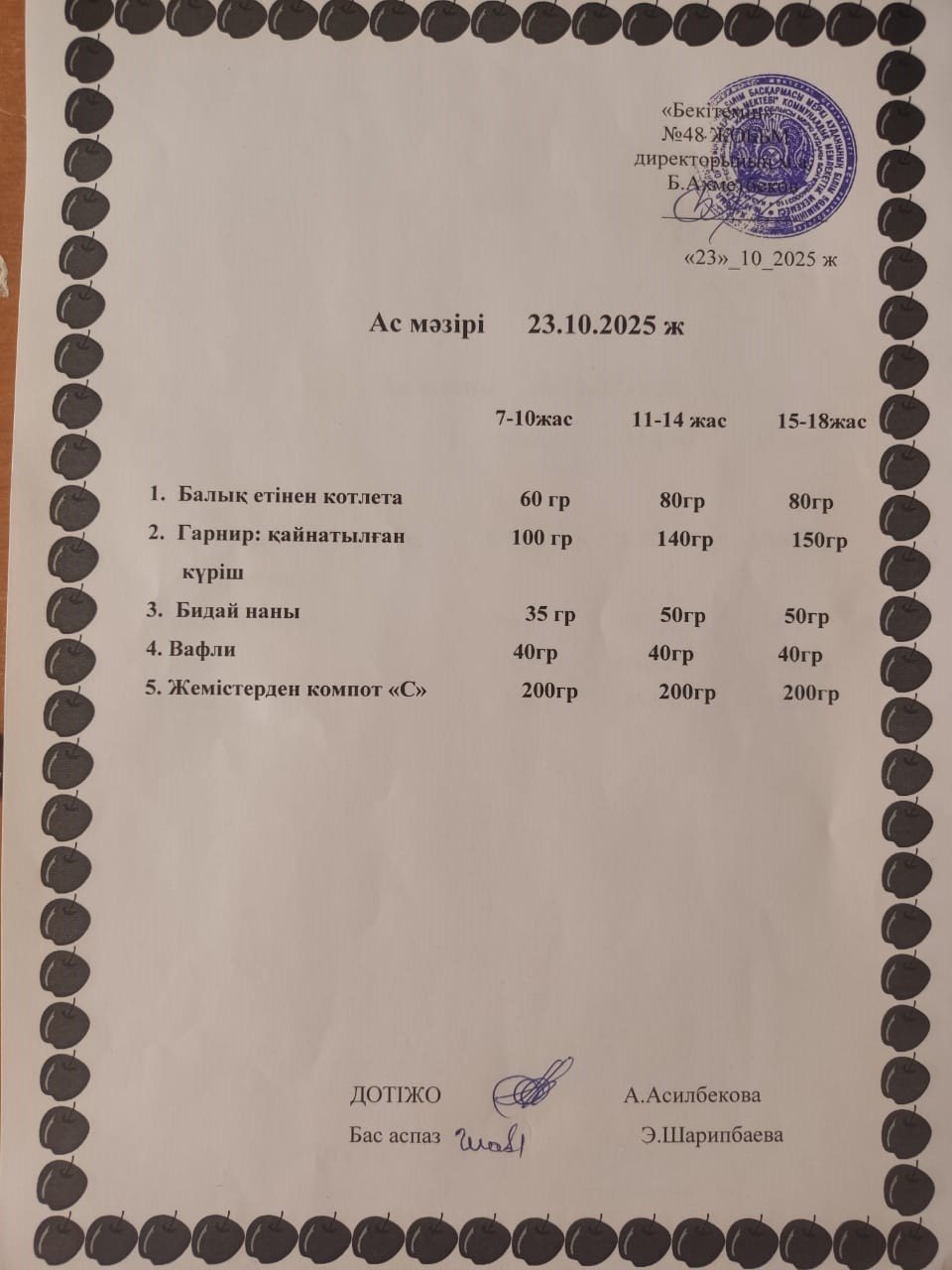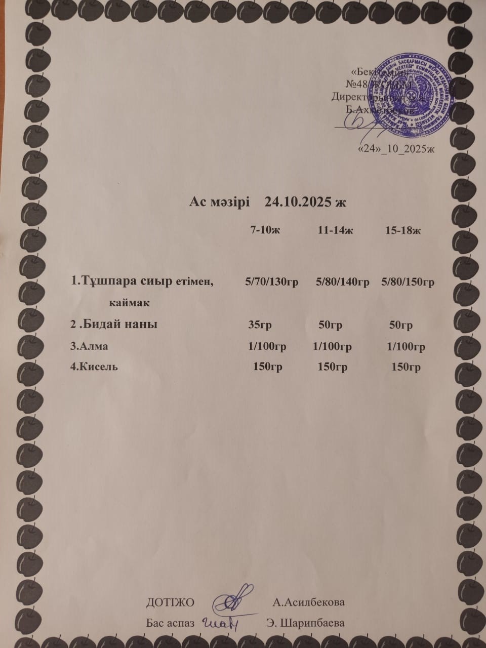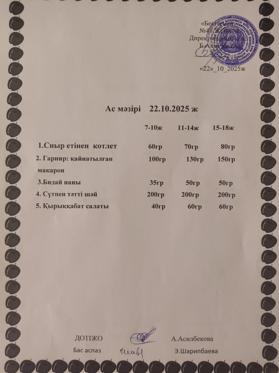 Ас мәзірі қазан айы » ОШ №48 п. Ойтал